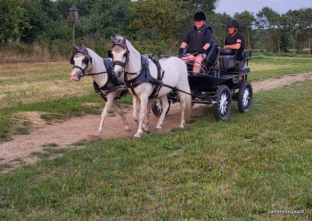 Det er meget, meget længe siden, måske 1 1/2 år siden de to gamle har været spændt for, men nu skulle det lige prøves igen. Heldigvis har de ikke glemt det, og ved godt, hvad der skal ske. De stod pænt stille til at blive spændt for, så nu prøver vi igen. De har stadig deres unoder, men jeg har nu valgt at få hjælp af Alis Jensen til at komme godt i gang igen. Det bliver aldrig de store, lange ture de kommer til at køre. De to har trods alt en alder på +20 måske +25. Den nøjagtige alder kender jeg ikke, men det er da et par gamle ponyer. Jeg glæder mig til igen at komme lidt ud at køre.