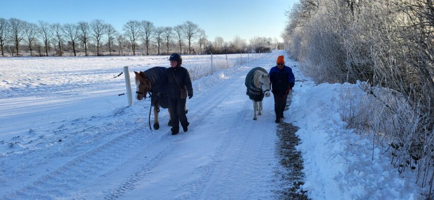Når det er rigtig koldt og meget glat, er det jo ikke rigtig vejr til at spænde for vogn. Til gengæld er en gåtur i sneen godt for både dyr og mennesker (os der gerne vil af med julekiloene igen). Det var smuk sol men bidende koldt, endda så koldt, at Mille have is i skægget. Det er vist mange år siden, vi har prøvet det, men dyrene nød en lille tur ud i sneen, og vi fik røde kinder.